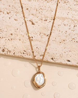 Genette Natural Shell Inlaid Set Irregular Frame Pendant Curb Cuban Chain Gold Necklace