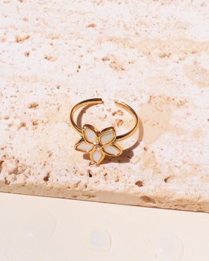 Mela Top Head Flower Shaped Shell Stone Petal Zircon Center Pollen Design Gold Open Ring