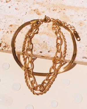 Mitzi Triple Layer Flat Wide Snake Chain Twisted Rope Chain Textured Paperclip Design Gold Bracelet
