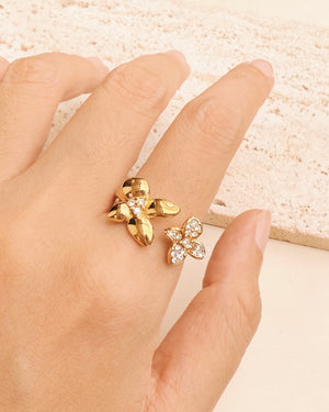 Daenerys Dual Flower Shaped Zircon Paved Hammered Design Big Small Top Center Design Gold Open Ring