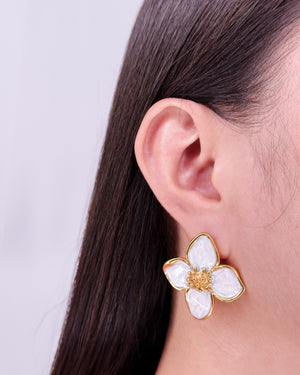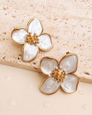 Dayna Shell Stone Flower Shaped Bezel Set Solid Pollen Center Design Gold Stud Earrings