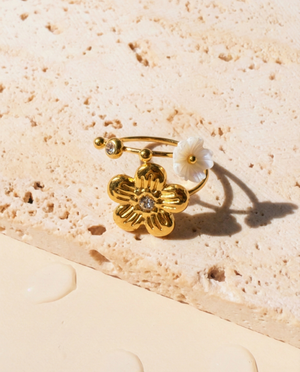 Faryth Dual Top Head Small Flower Shaped Shell Stone Big Zircon Flower Shaped Design Layered Look Gold Open Ring
