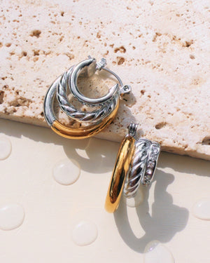 Drew (Two Tone) Triple Layer C-Shaped Small Zircon Paved Medium Twisted Hoop Design Big Half Silver Half Gold Layered Look Hoops