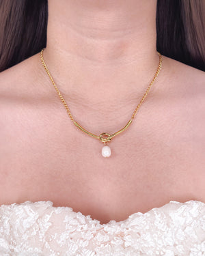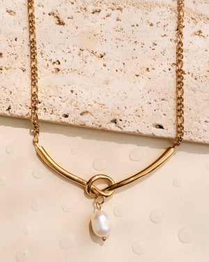 Eden Figaro Chain V-Shaped Interlaced Long Bar Pendant Pearl Drop Centerpiece Gold Necklace