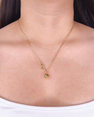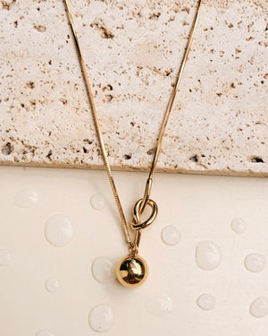 Hayden Knot Bar Side Pendant Center Solid Ball Drop Pendant Rounded Snake Chain Gold Necklace