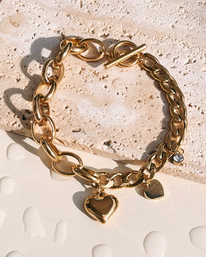 Paige Dual Design Half Oval Link Half Curb Chain Zircon Heart Pendants Chunky Gold Bracelet