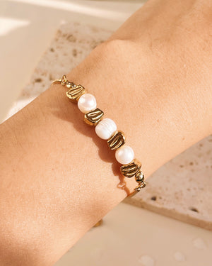 Cassidy Center Pearl and Geometric Beaded Thin Snake Chain Gold Bracelet