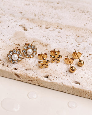 Heather (Bundle Set) 3 Pairs Dainty Zircon Paved Pearl Flower Solid Flower Round Ball Gold Studs