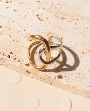 Elysia (Two Tone) Half Silver Half Gold Layered Look Intertwined Flowy Wave Design Open Ring