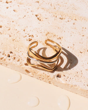 Gretchen (Two Tone) Silver Gold Triple Layer Water Ripple Design Wide Open Gold Ring