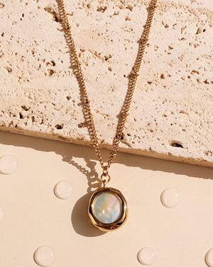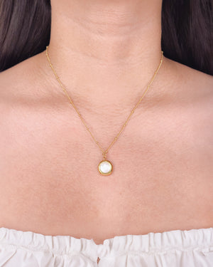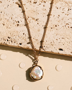 Ezmae Flat Pearl Inlaid Bezel Setting Pendant Ball Beaded Link Chain Gold Necklace