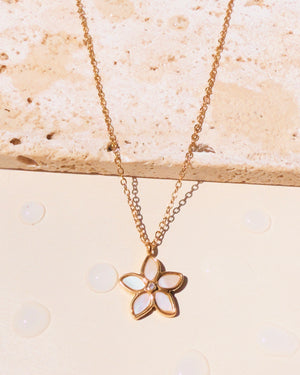 Margie Chunky Flower Shaped Shell Stone Petal Zircon Center Design Pendant Thin Cable Link Chain Gold Necklace