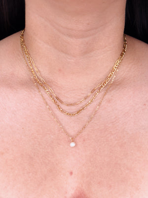 Megan Triple Layer Paperclip Chain Figaro Chain Thin Link Chain Tiny Pearl Pendant Gold Necklace