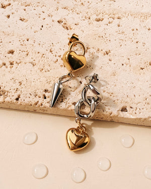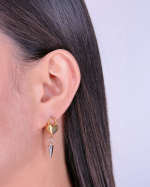 Kara Dual Design Two Tone Gold Heart Lock Silver Arrowhead Dangle Silver Chain Gold Heart Dangle Design Drop Earrings