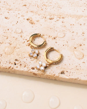 Livia Zircon Paved Rounded Huggies Quad Flower Shaped Zircon Crowned Set Gold Drop Earrings